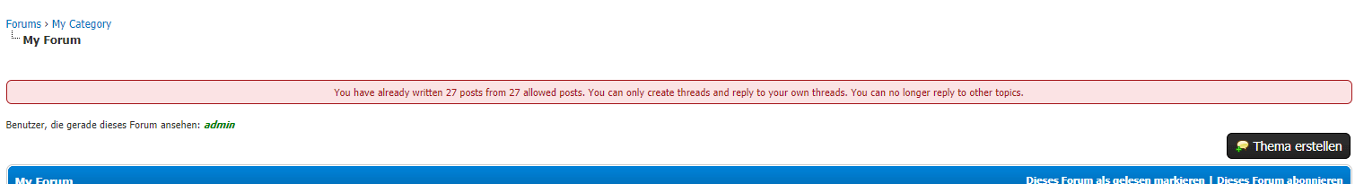 - Zum Beispiel kann der Benutzer nicht mehr auf fremde Threads antworten oder eher kann nicht mehr auf eigene Threads antworten. Möglicherweise kann der Benutzer auch keine neuen Themen erstellen. Dies ist alles in den Plugin-Einstellungen definierbar.