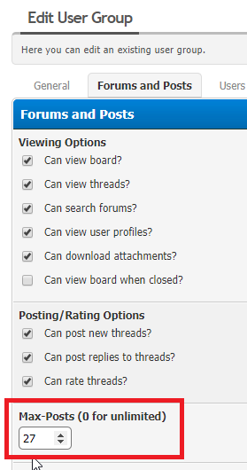 Specify a maximum number of posts per user group. If this number of posts has been reached or exceeded by a user of the group, the user can be blocked for new posts or new threads / topics. It can be set whether the user: