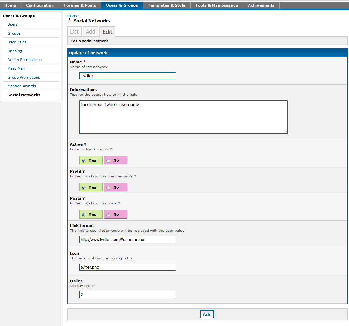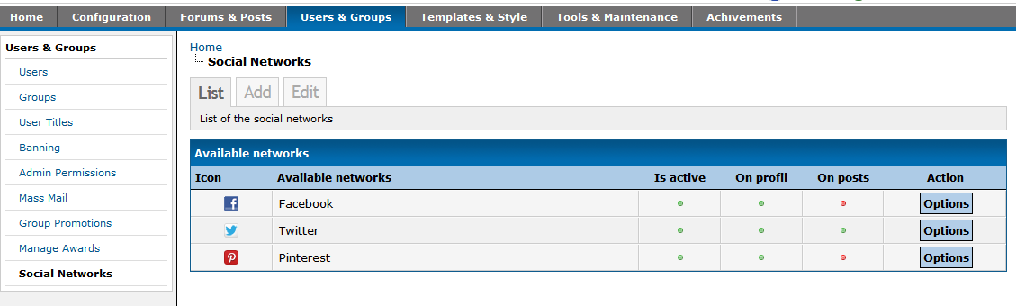 The user then has the option to specify its identifier on these networks and links are displayed on the profile page and / or the mini-profile in his posts.