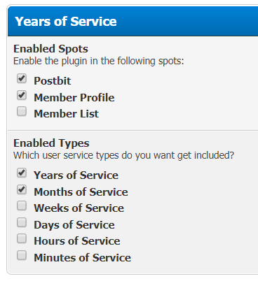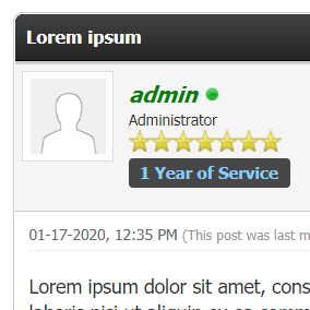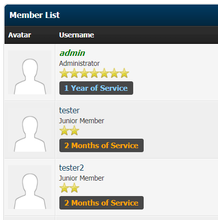 Show in the postbit, member profile, member list, the time of user service based on their registration date. It can be used as alternative (or concurrently) to the user registration date.Autor: Mipher