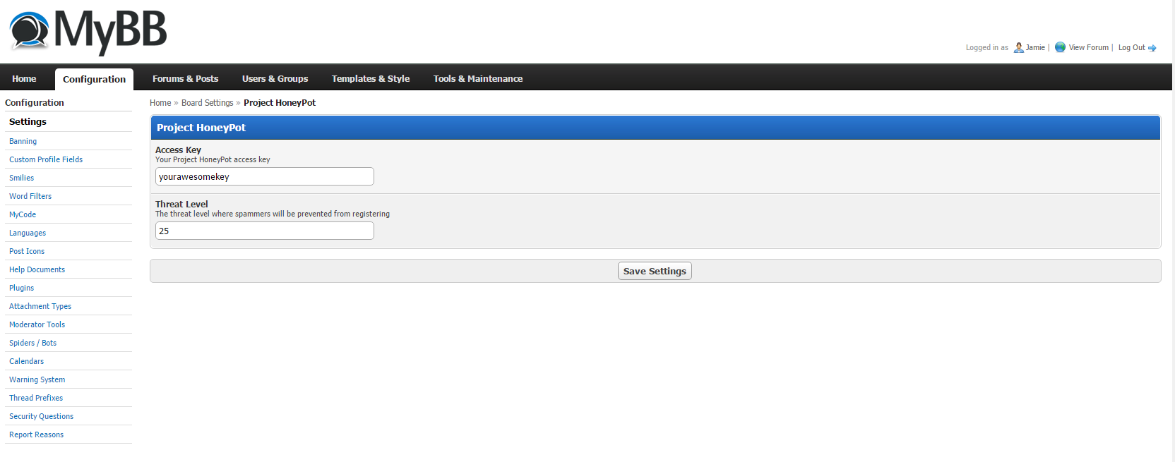 3. Now, head back to the "Configuration" page and scroll to the bottom of the page to find the "Project HoneyPot" settings under "Plugin Settings". On this page you will need to enter your access key; you can also configure your threat level threshold on this page too.