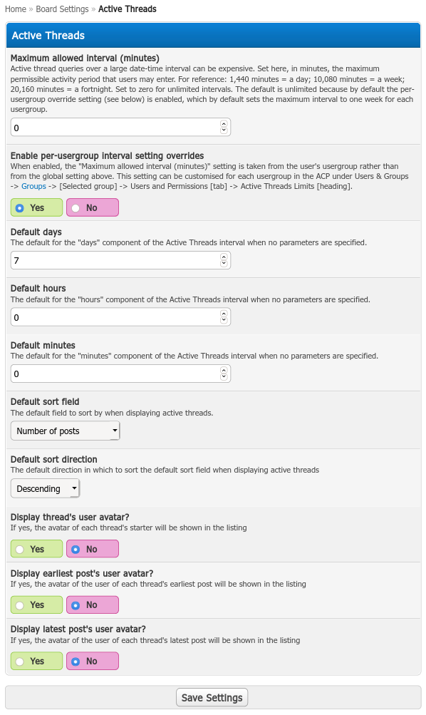 - The maximum allowable interval in minutes, either globally or on a per-usergroup basis. This is because longer intervals can be resource-intensive on the database, and expose your forum to DoS attacks. By default, the maximum interval is set to one week for each usergroup.