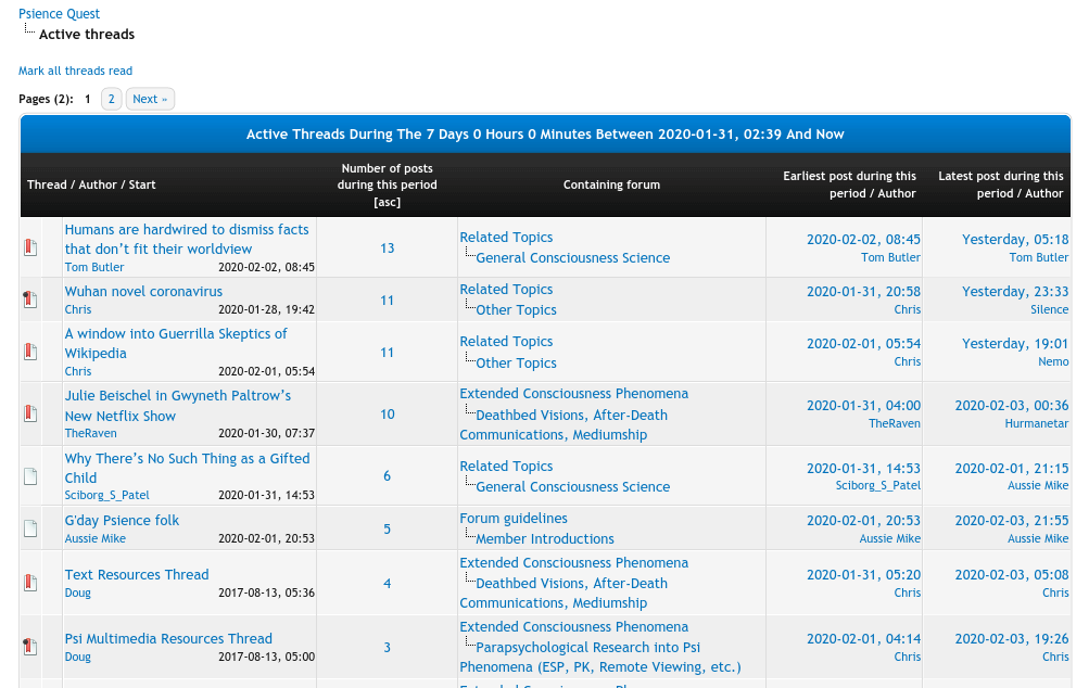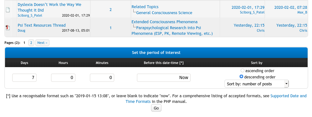 Secondly, to view, in order from most recent to earliest, the latest post to all threads which have been posted to over a certain (configurable) period, defaulting to the most recent 7 days. This can be achieved by sorting in descending order by the final column (date of most recent post to the thread).
