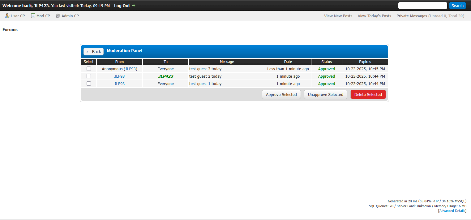 - Moderator panel (ModCP) with bulk actions: approve, unapprove, delete
