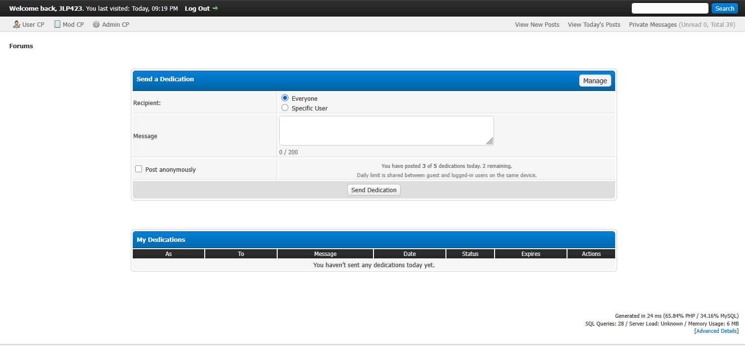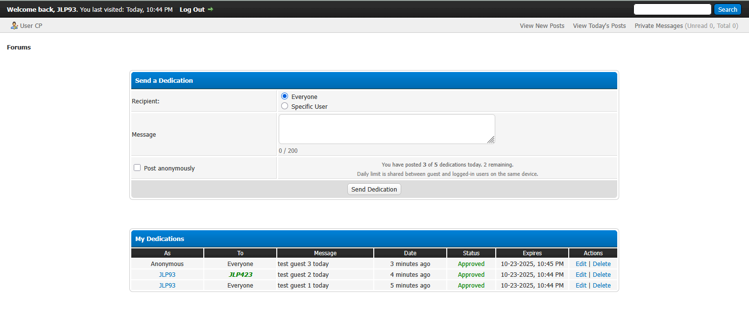 - Mods/Admins can approve, unapprove, or delete dedications in ModCP