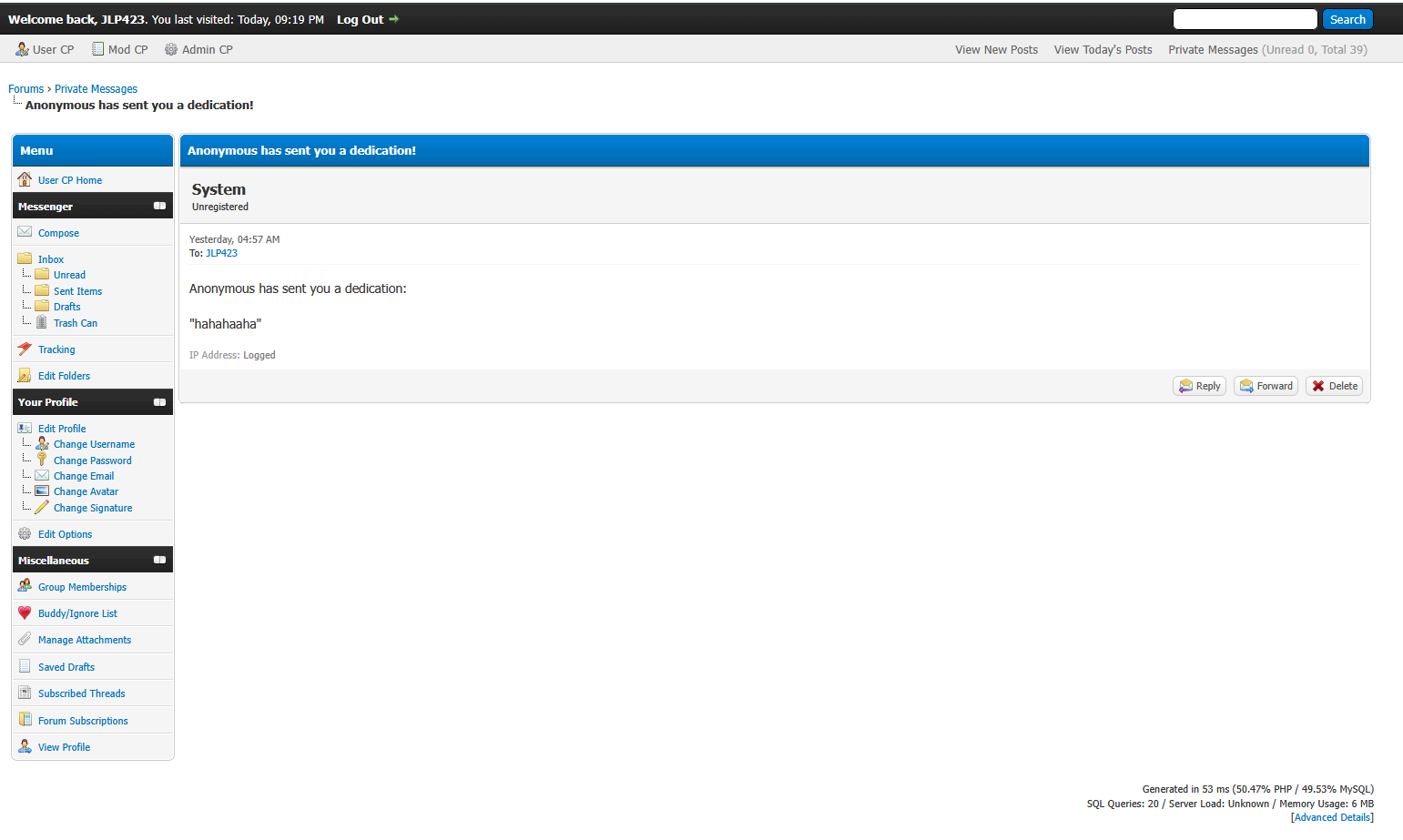 Messages can be addressed to everyone or specific users, styled with colorful themes, posted anonymously, and managed directly in the ModCP with full moderation control.