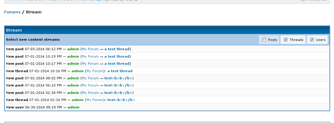 Creates real-time stream of new content appearing on the forums, available in small window on the index and a separate page.