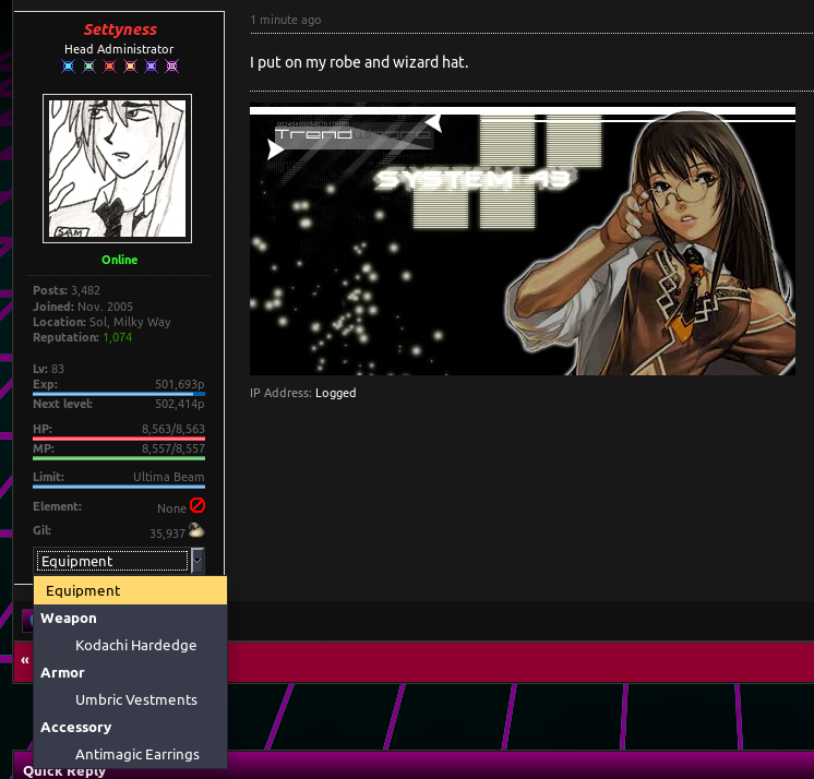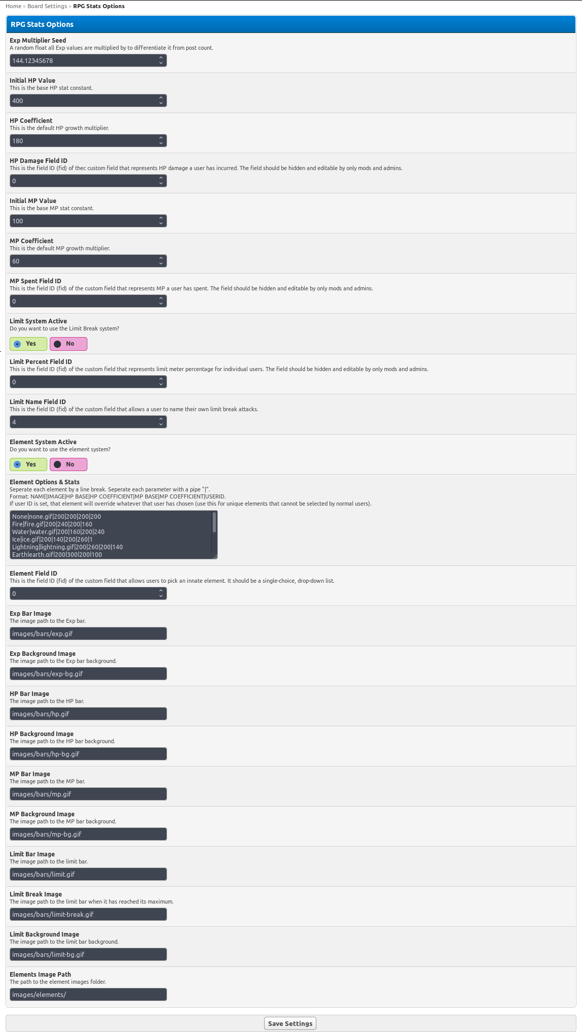 This plugin adds Lv, Exp, HP, MP, Limit Break, and Element stats and bars to postbits. The stat maxes increase with post count and the current values are editable via custom profile fields. Useful for RP/battle arena style forums or just for fun.Autor: Settyness