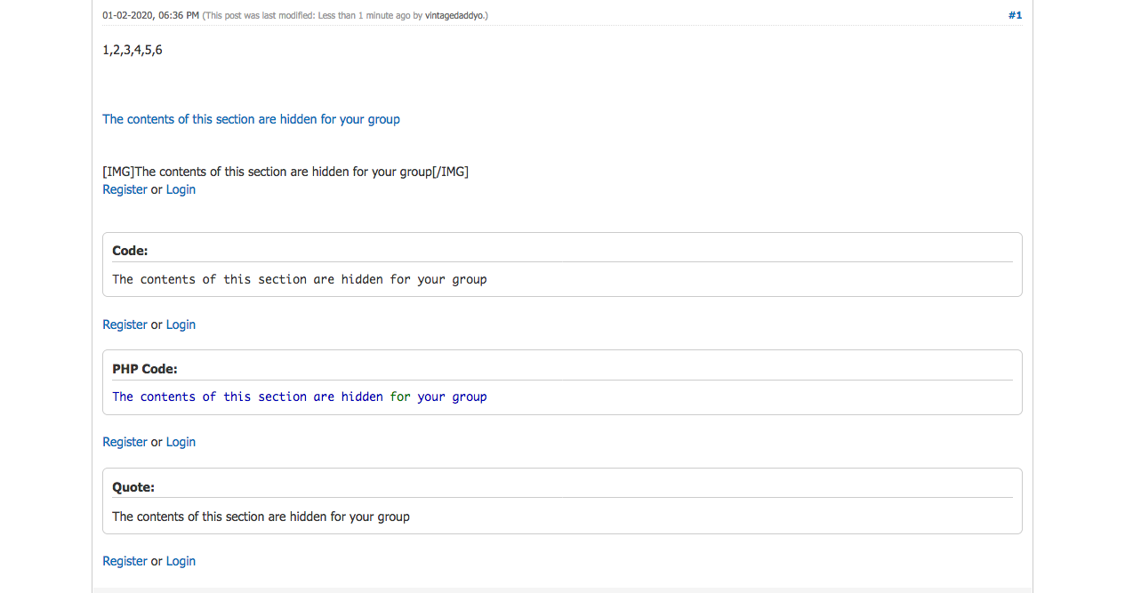 Text to be appended to the end of the hidden text.<br /> <br /> <div class="red_alert"><img style="vertical-align:middle;" src="images/error.png"> <strong>The contents of this section are hidden for your group</strong></div> <a href="member.php?action=register">Register</a> or <a href="member.php?action=login">Login</a>