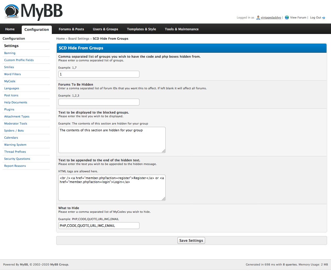 This plugin will hide the contents of a MyCode tagged portion of a post from any user groups selected in the SCD Hide From Groups section in the Admin CP->Configuration->Settings. It defaults to 1 (Guest). You use a comma separated list of group ids you want it to check and hide the code from. It checks both the regular gid and the additional gids of the user.