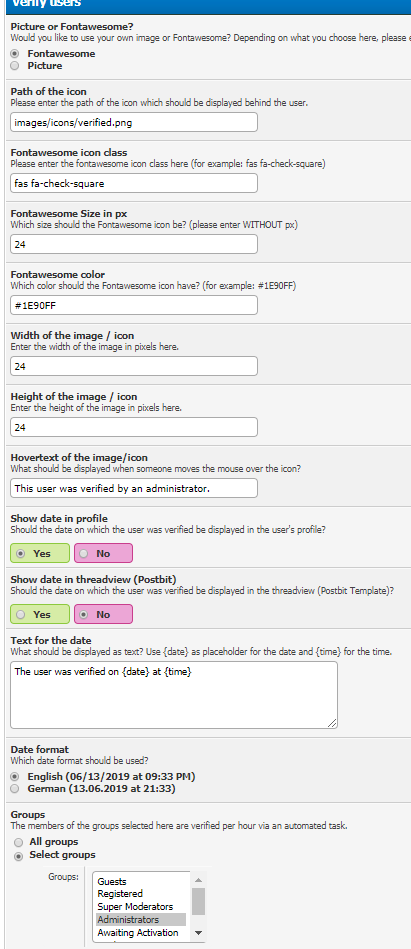 - New Since 20.06.2019: Select groups whose members are automatically verified. (This happens 1x per hour)