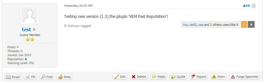 XEM Fast Reputation is a plugin familiar to users of IPB, allows rapid evaluation of posts. This extension I use the built in MyBB reputation, so it quick and does not burden the server. Performs only one additional SQL query to retrieve and process information about liked posts. Evaluate the posts can be positive (+1) and negative (-1). We can always change your assessment of the post or cancel it completely.
