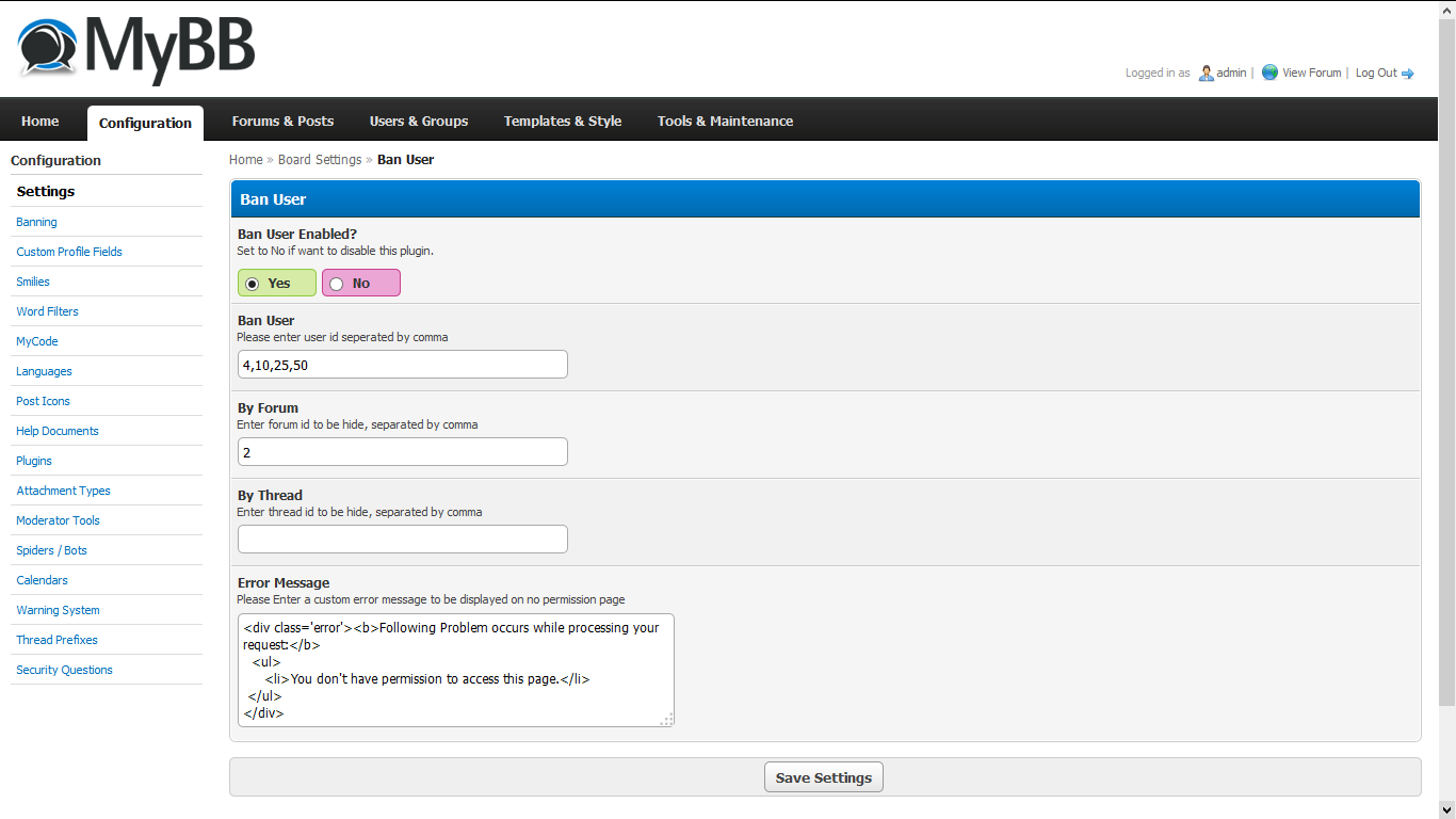 - To Manage Settings, Go To ACP > Configuration > Settings > Ban User