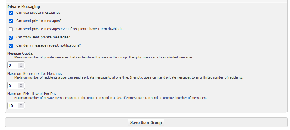 Allows admins to limit the number of Private Messages that users in a usergroup can send per day.