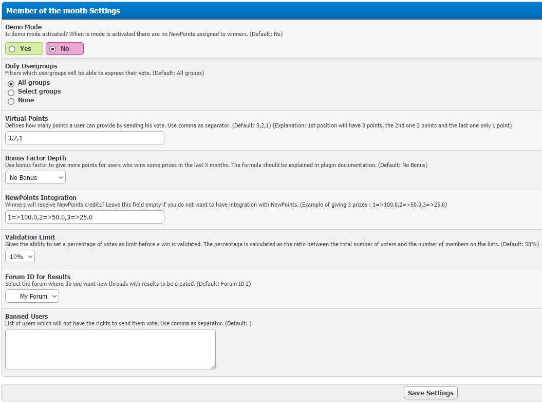 - Setting for specifying a validation limit. You have the ability to set a percentage of users who must voted in a month to validate the result.