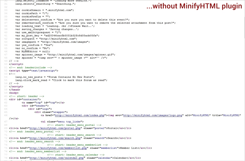 Plugin ignores content in textarea, pre and script tags. Also it doesn't removes inline javascript codes or template comments.