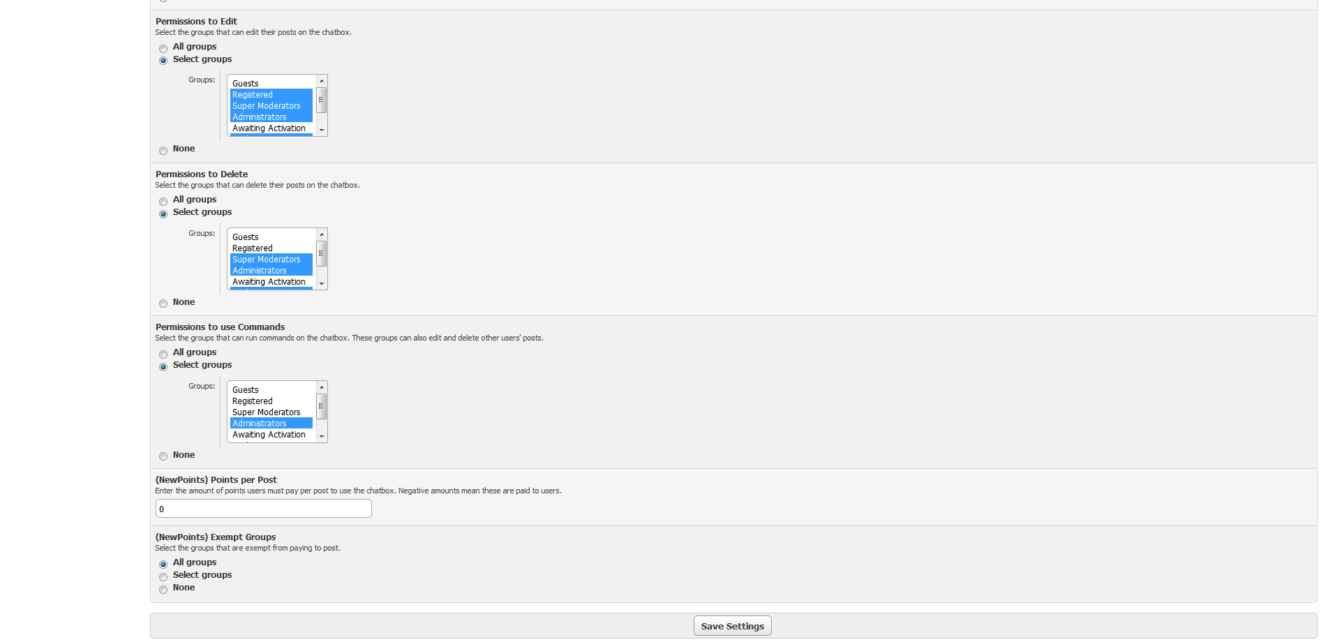- Permissions per group: allowed to view, post, edit, delete and commands.