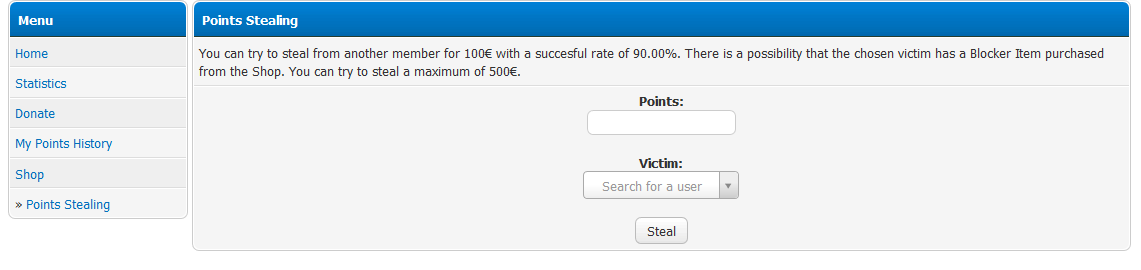 Allows users to steal points from other users. A price can be set for stealing, with a chance of success and the possibility of receiving PM alerts on success/failure.