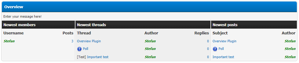 Dieses Plugin fügt eine Box auf der Startseite des Forums ein, die verschiedene Informationen zum Forum zeigt (Neueste Mitglieder, neueste Themen,....