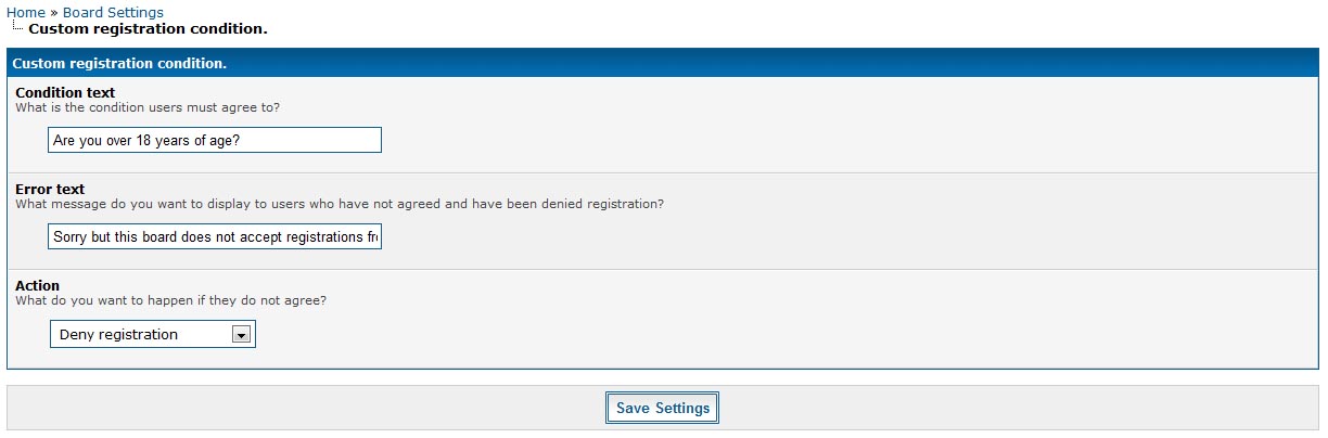 Adds an additional check box to the registration agreement for your own condition, eg. users must be over 18