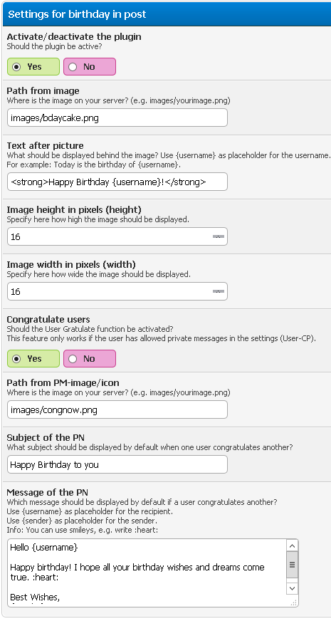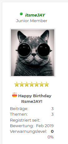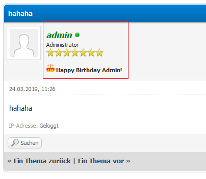 Wenn der Benutzer heute Geburtstag hat und in den Einstellungen "Geburtstag + Alter anzeigen" aktiviert hat, wird der Geburtstag in jedem Beitrag des Benutzers für heute angezeigt. Dem Benutzer kann per Klick auf ein ICON über PN gratuliert werden.