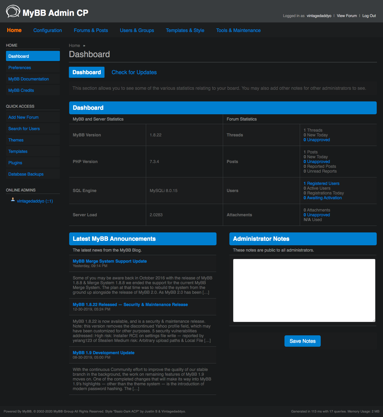- 2 (alt). Go to ACP > Home > Preferences > Select "Basic-Dark" in "Admin Control Panel Theme" and press "Save Personal Notes & Preferences".
