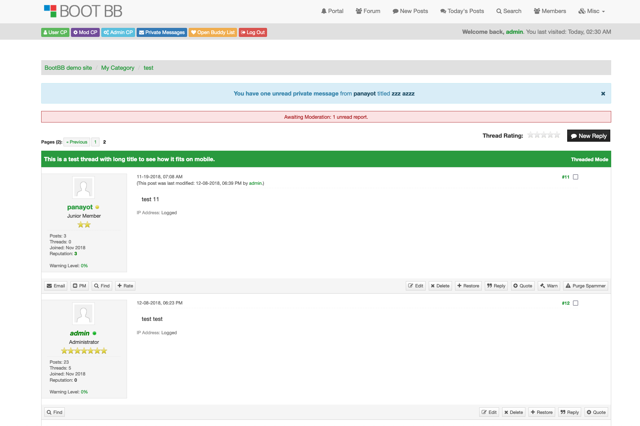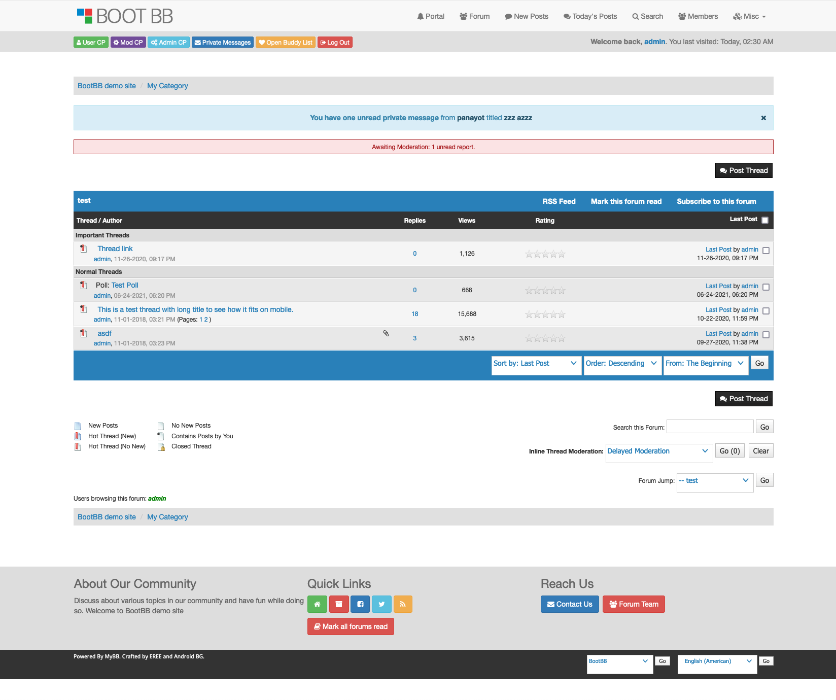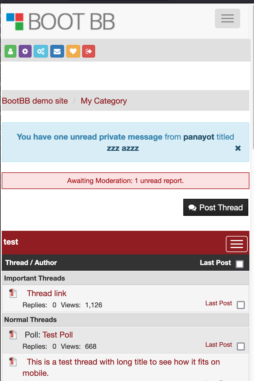 BootBB Reloaded is compatible with MyBB 1.8. This theme uses Bootstrap 3 framework and Fork-Awesome Icons and has the following features: