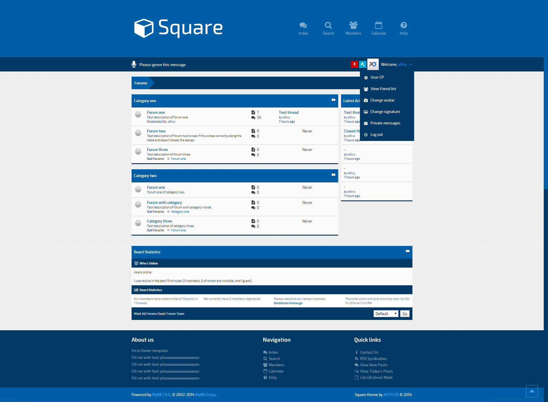 Square is a minimalistic theme, renewed for MyBB 1.8 series. You can find a lot of details, animated forums, sidebars, news and more with jQuery technology, and of course, all squared. Tested in the latest Google Chrome, Opera and Mozilla Firefox versions