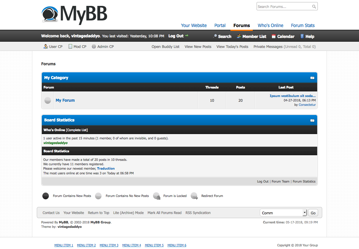 You may not remove or change the MyBB copyright nor the Designed by: "Vintagedaddyo" statements in the footer of this theme's templates. You may use and modify this theme to your personal likings, but redistributing a modified version for download is prohibited, unless you have explicit written permission from "Vintagedaddyo", though you are allowed to redistribute a copy that has not been modified.