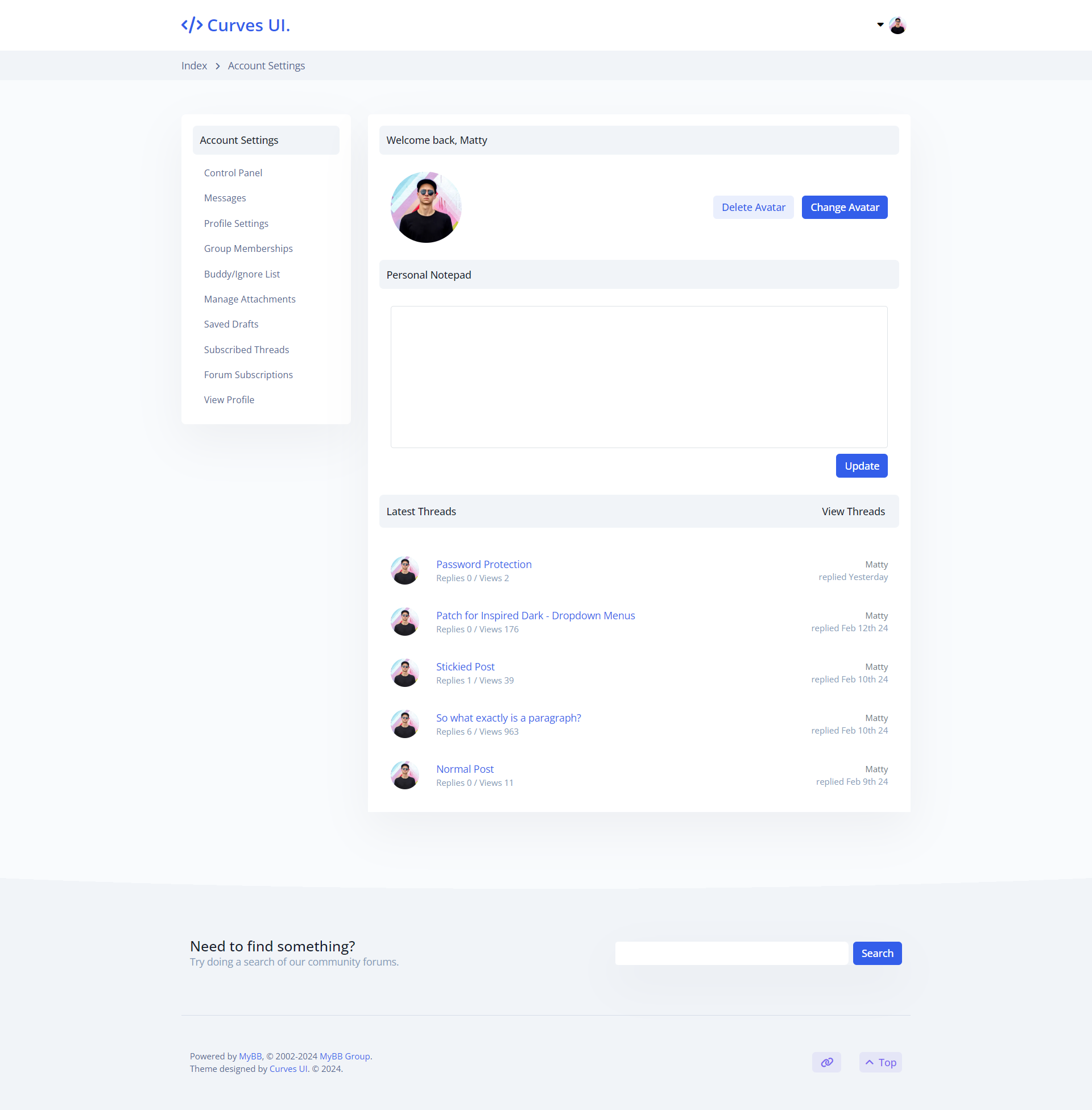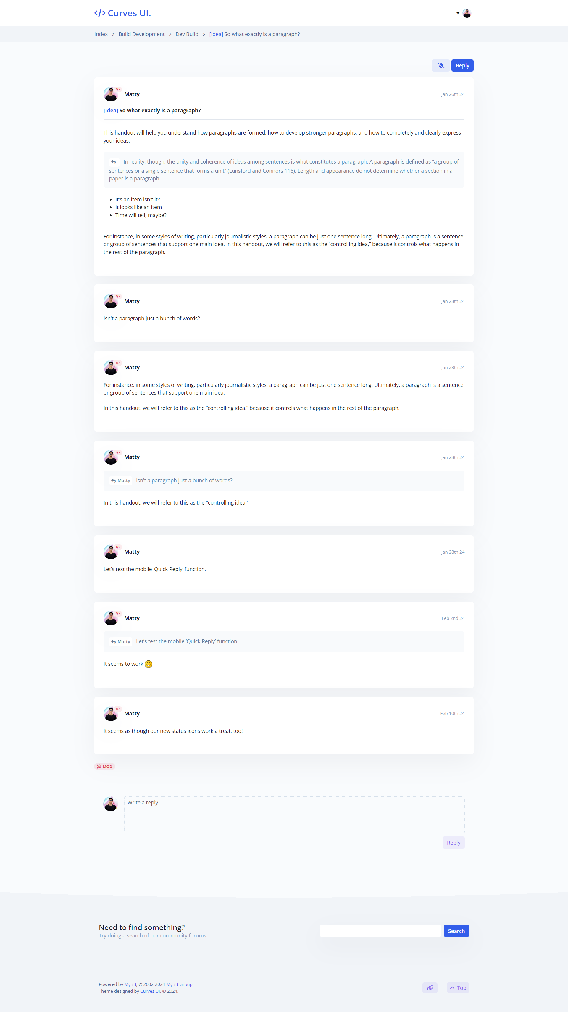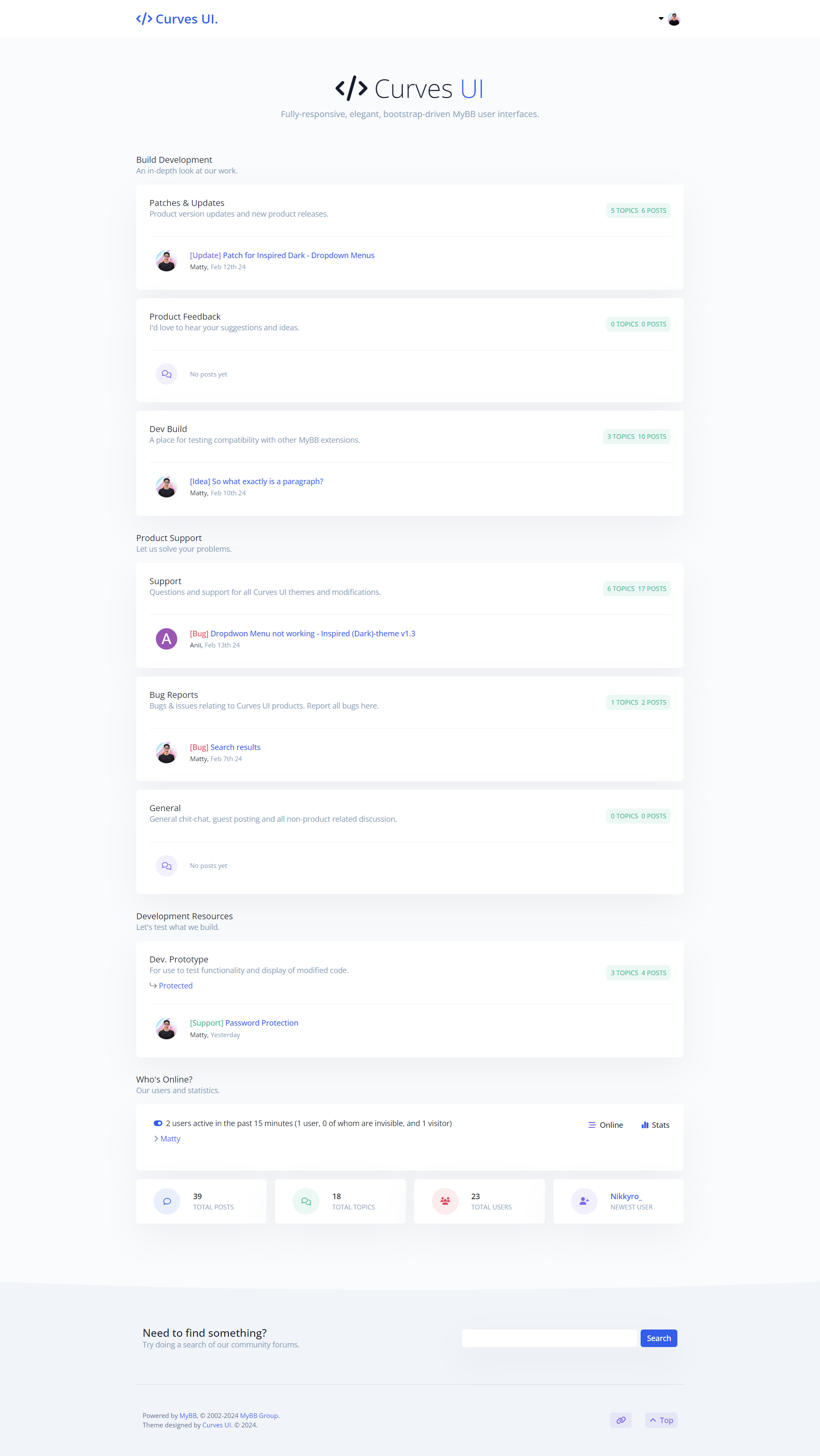 Curves UX is the theme I had developed originally for my own personal site but have decided to release it here due to a high number of requests. It's a simplified, clean and mobile-first theme built using Bootstrap (5.3) and Font Awesome 6 that is designed to bridge the gap between conventional forum themes and social media platforms.