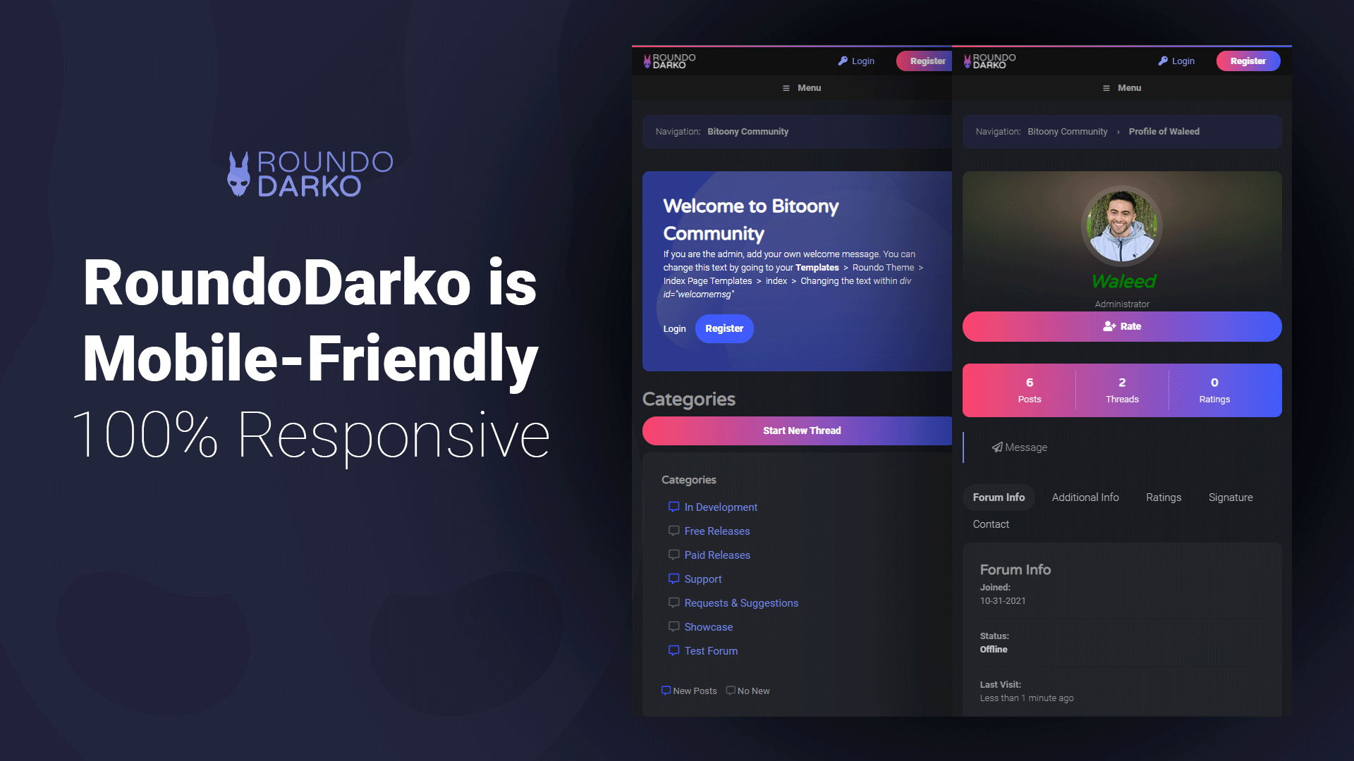 Roundo-Darko is a dark version of the Roundo theme. This theme gives a dark, modern, responsive look to MyBB.