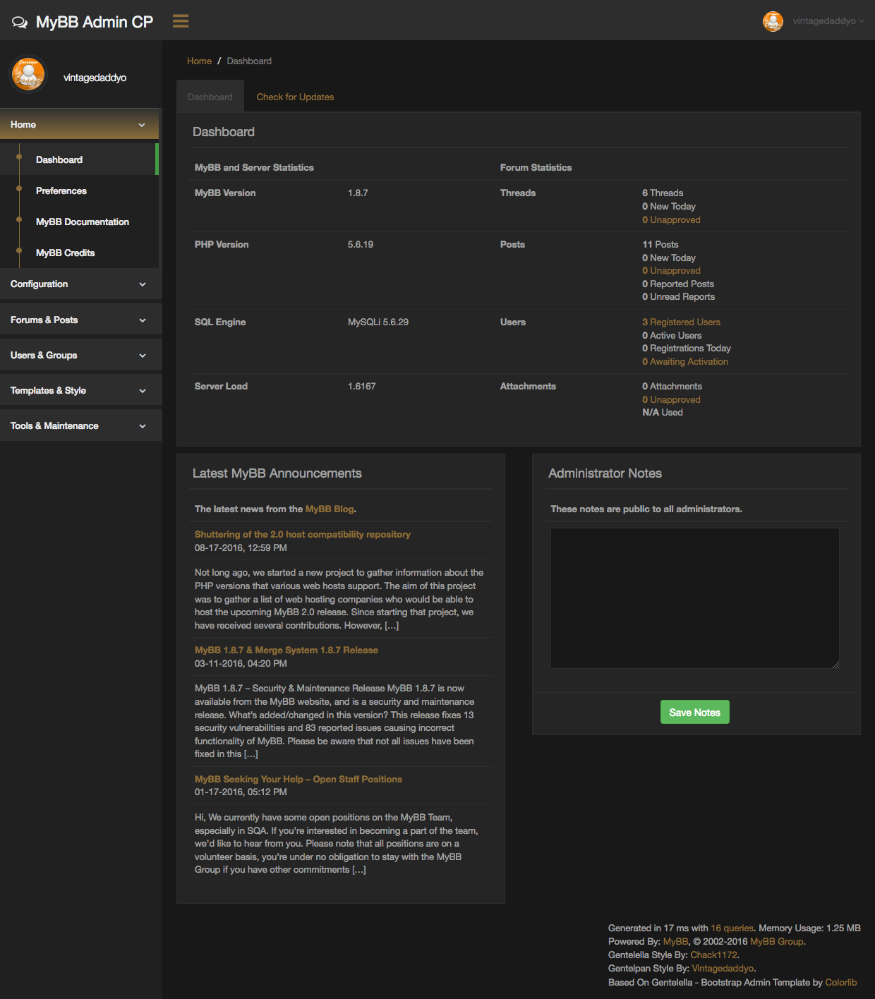 GentelDark Series: Part 3 is several dark variants of the MyGentelella style which is a theme for the MyBB AdminCp. The theme is responsive and it is maded with bootstrap. The theme is based on the Gentelella admin control panel of Colorlib.Autor: vintagedaddyo