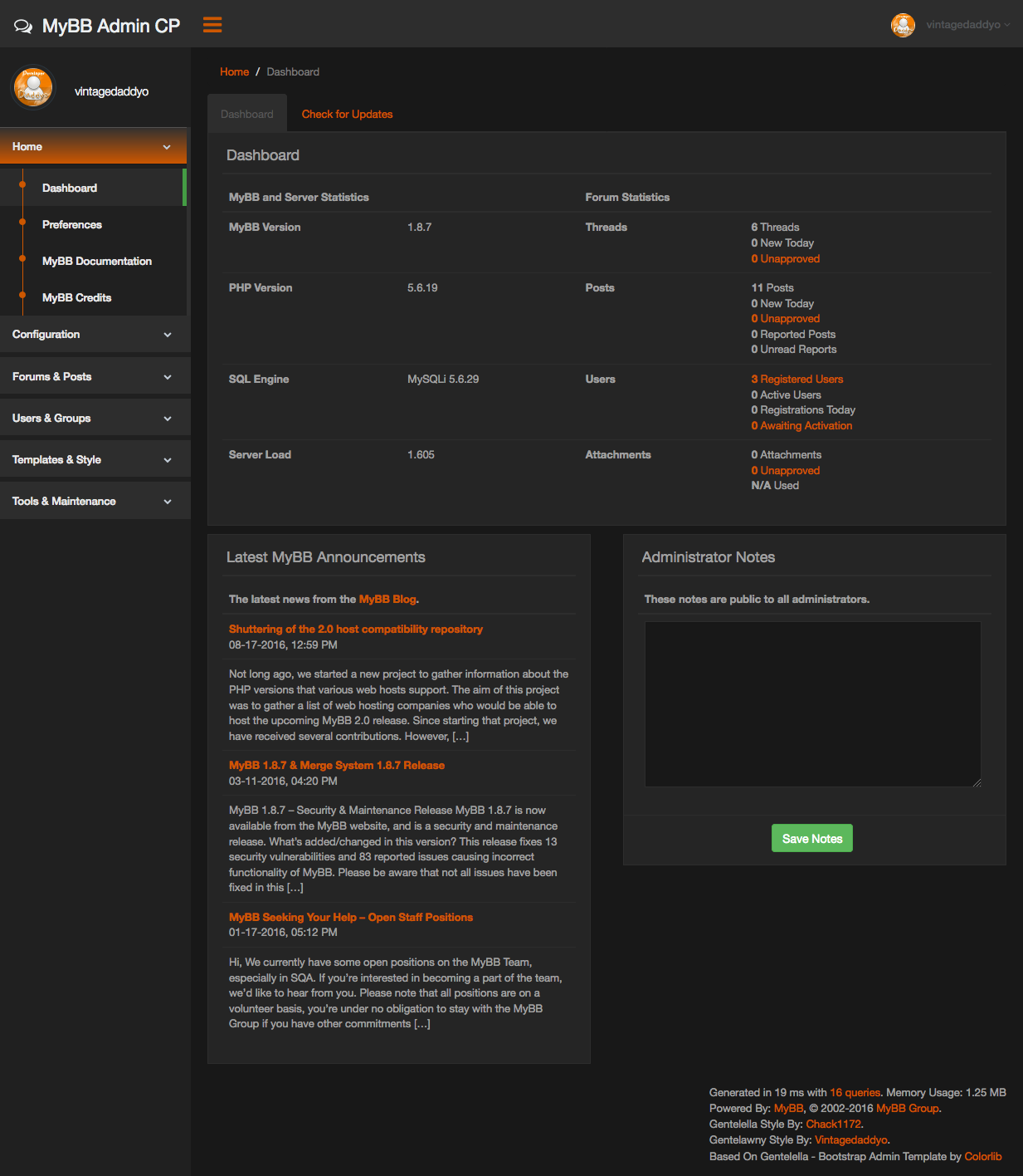 GentelDark Series is several dark variants of the MyGentelella style which is a theme for the MyBB AdminCp. The theme is responsive and it is maded with bootstrap. The theme is based on the Gentelella admin control panel of Colorlib.