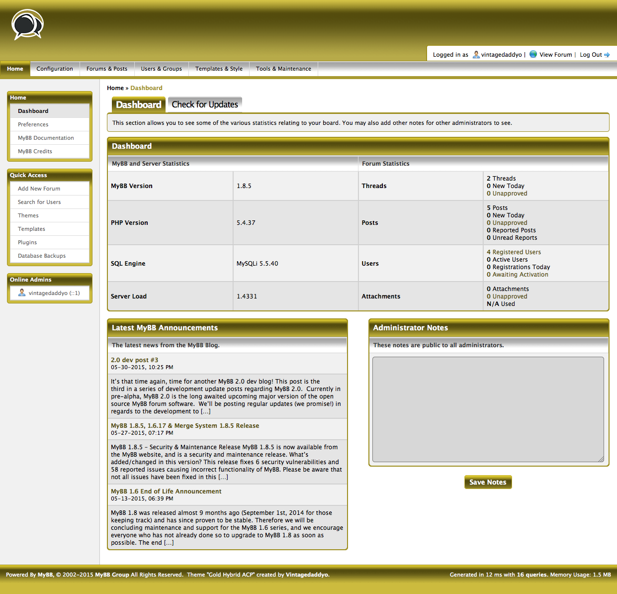 You may not remove or change the MyBB copyright nor the Designed by: "Vintagedaddyo" statements in the footer of this ACP Style's templates. You may use and modify this ACP Style to your personal likings, but redistributing a modified version for download is prohibited, unless you have explicit written permission from "Vintagedaddyo", though you are allowed to redistribute a copy that has not been modified.