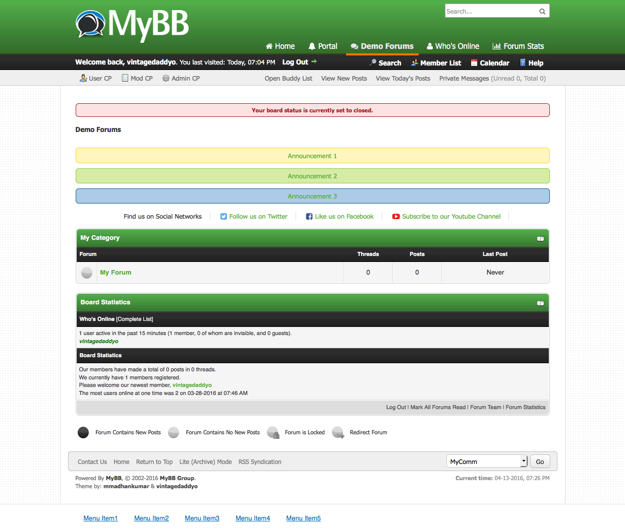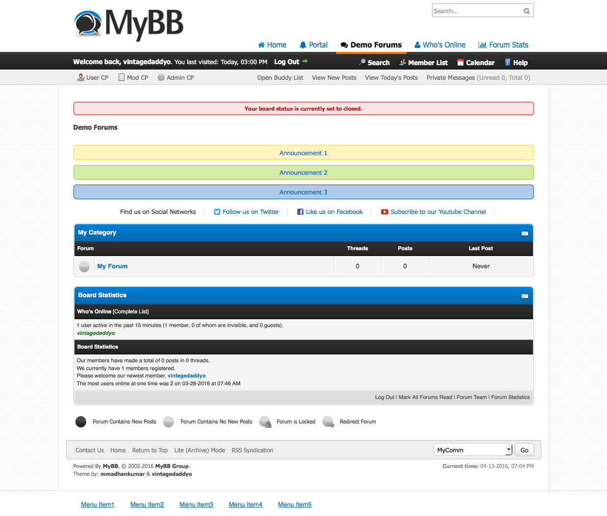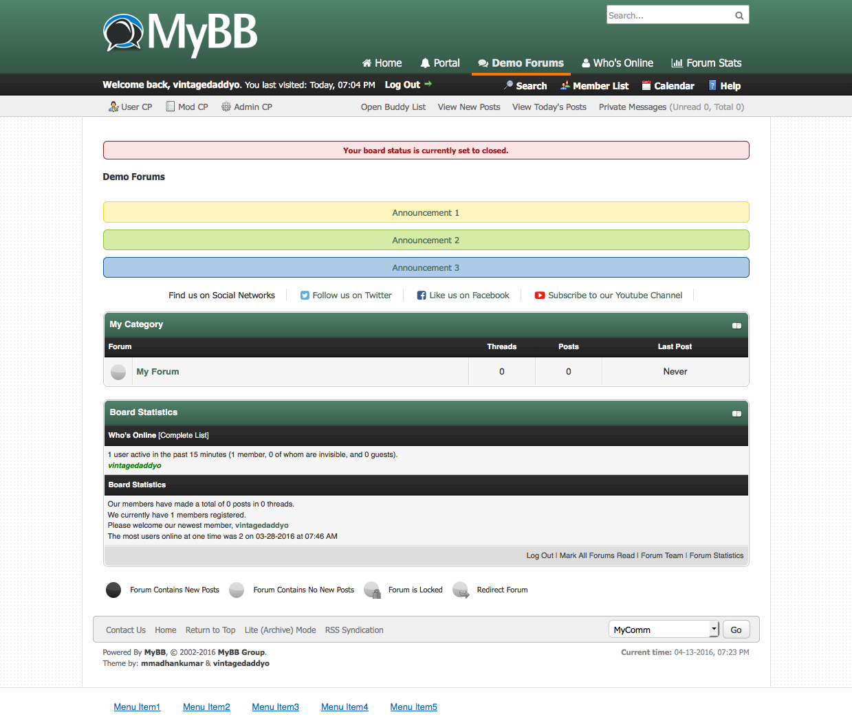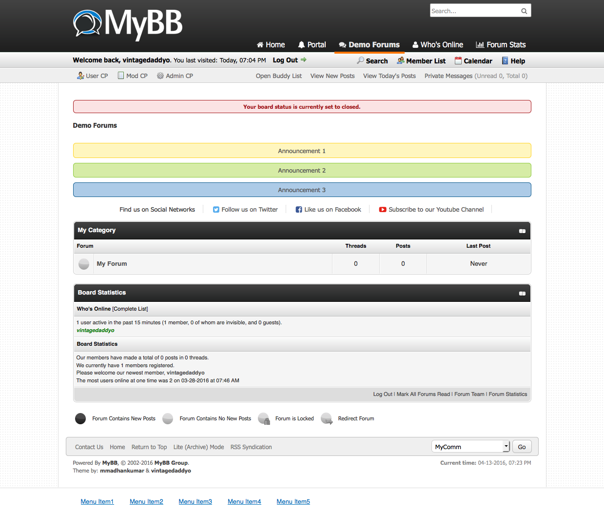 You may not remove or change the MyBB copyright nor the Designed by: "Vintagedaddyo" or "mmadhankumar" statements in the footer of this theme's templates. You may use and modify this theme to your personal likings, but redistributing a modified version for download is prohibited, unless you have explicit written permission from "Vintagedaddyo" or "mmadhankumar", though you are allowed to redistribute a copy that has not been modified.