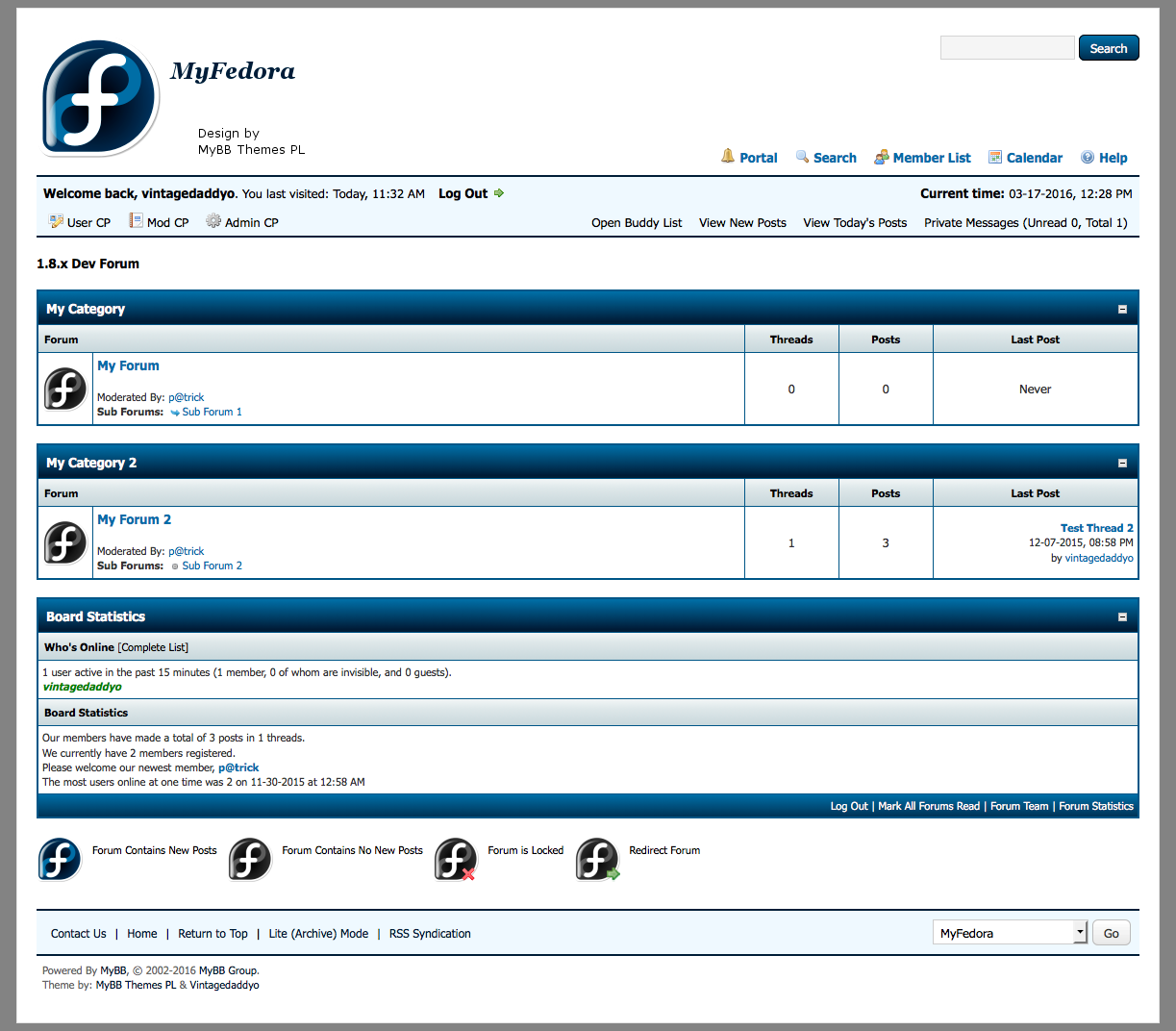 You may not remove or change the MyBB copyright nor the Designed by: "Vintagedaddyo" or "MyBB Themes PL" statements in the footer of this theme's templates. You may use and modify this theme to your personal likings, but redistributing a modified version for download is prohibited, unless you have explicit written permission from "Vintagedaddyo" or "MyBB Themes PL", though you are allowed to redistribute a copy that has not been modified.