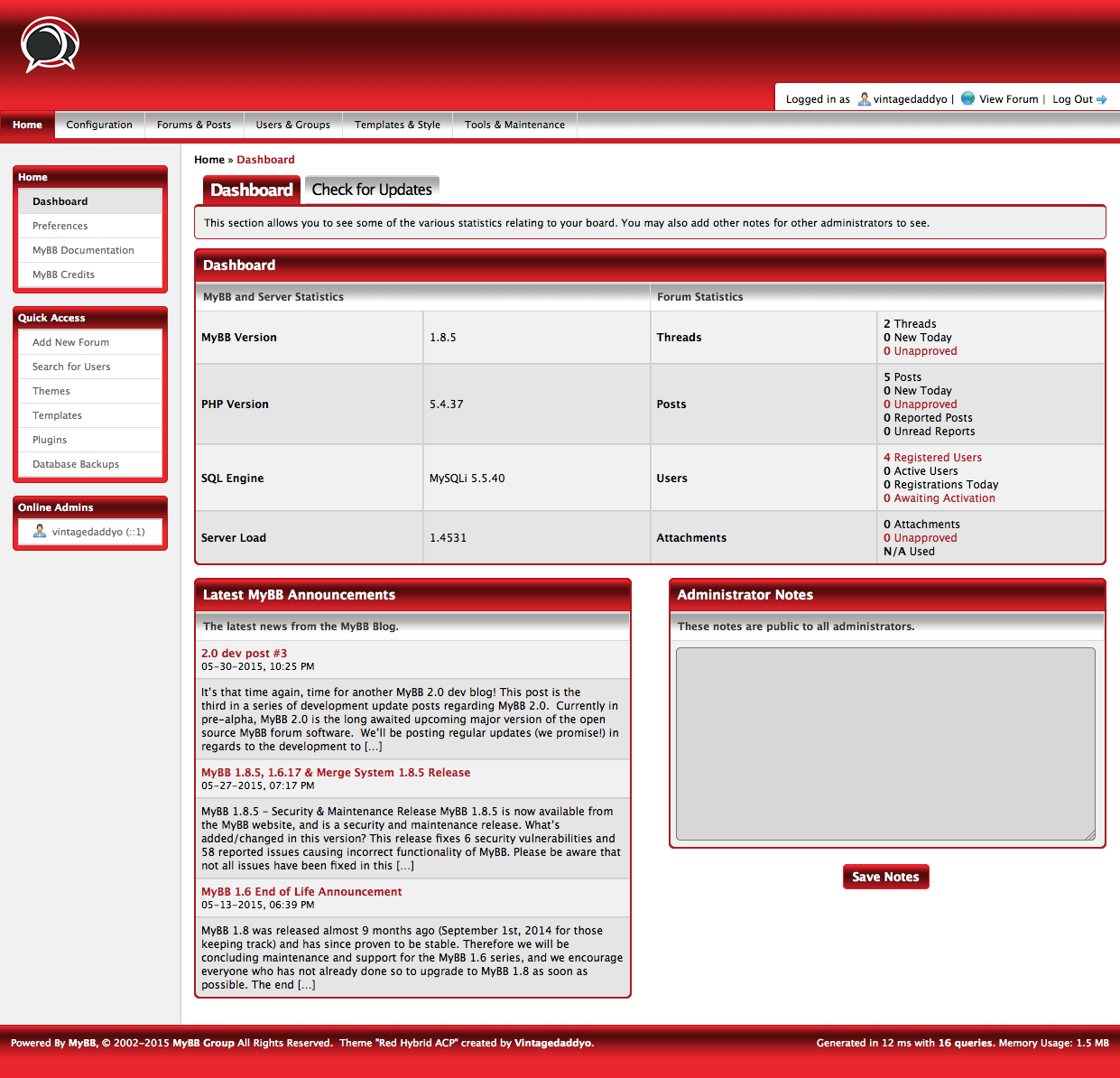 You may not remove or change the MyBB copyright nor the Designed by: "Vintagedaddyo" statements in the footer of this ACP Style's templates. You may use and modify this ACP Style to your personal likings, but redistributing a modified version for download is prohibited, unless you have explicit written permission from "Vintagedaddyo", though you are allowed to redistribute a copy that has not been modified.