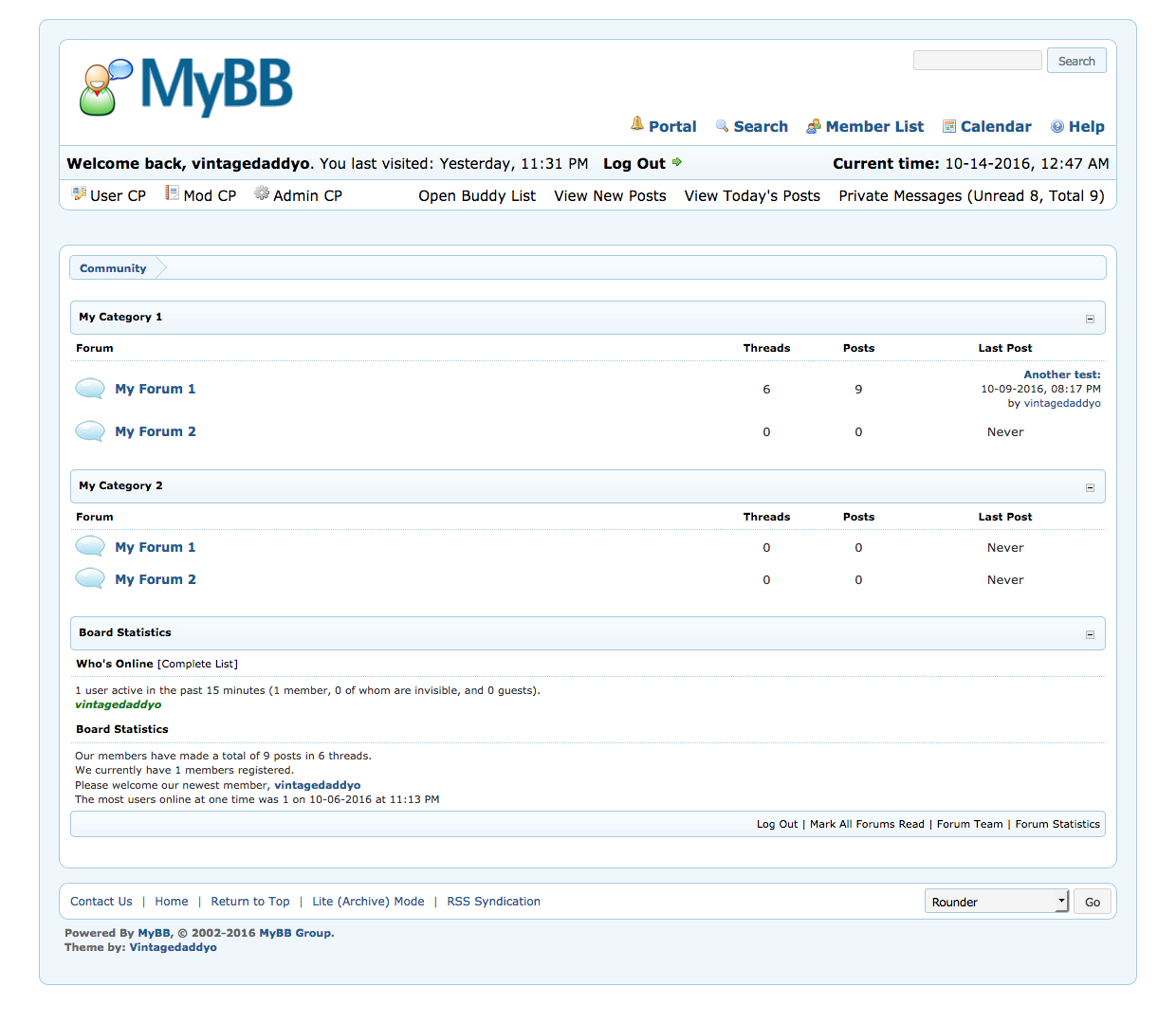 You may not remove or change the MyBB copyright nor the Designed by: "Vintagedaddyo" statements in the footer of this theme's templates. You may use and modify this theme to your personal likings, but redistributing a modified version for download is prohibited, unless you have explicit written permission from "Vintagedaddyo", though you are allowed to redistribute a copy that has not been modified.