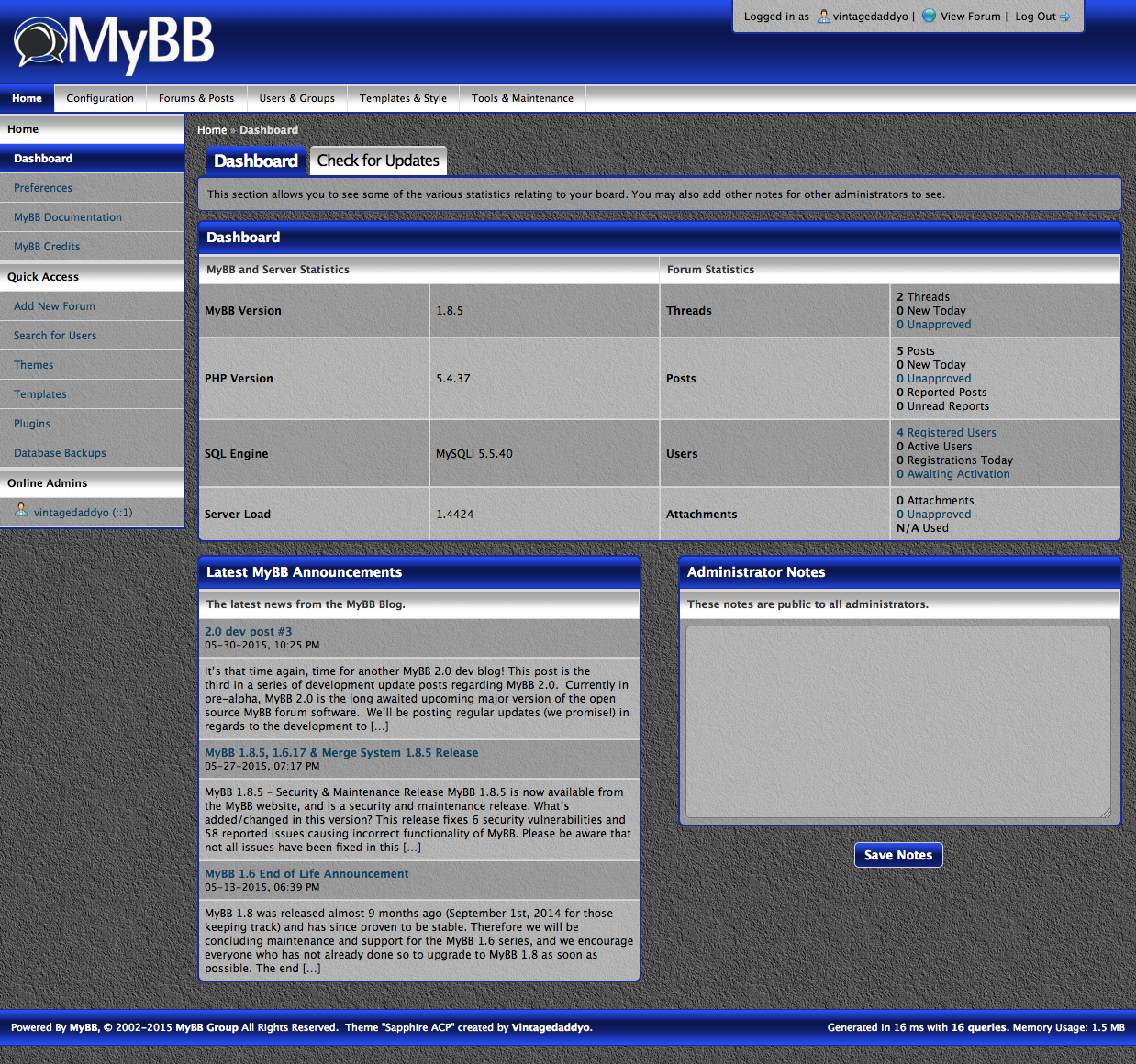 You may not remove or change the MyBB copyright nor the Designed by: "Vintagedaddyo" statements in the footer of this ACP Style's templates. You may use and modify this ACP Style to your personal likings, but redistributing a modified version for download is prohibited, unless you have explicit written permission from "Vintagedaddyo", though you are allowed to redistribute a copy that has not been modified.