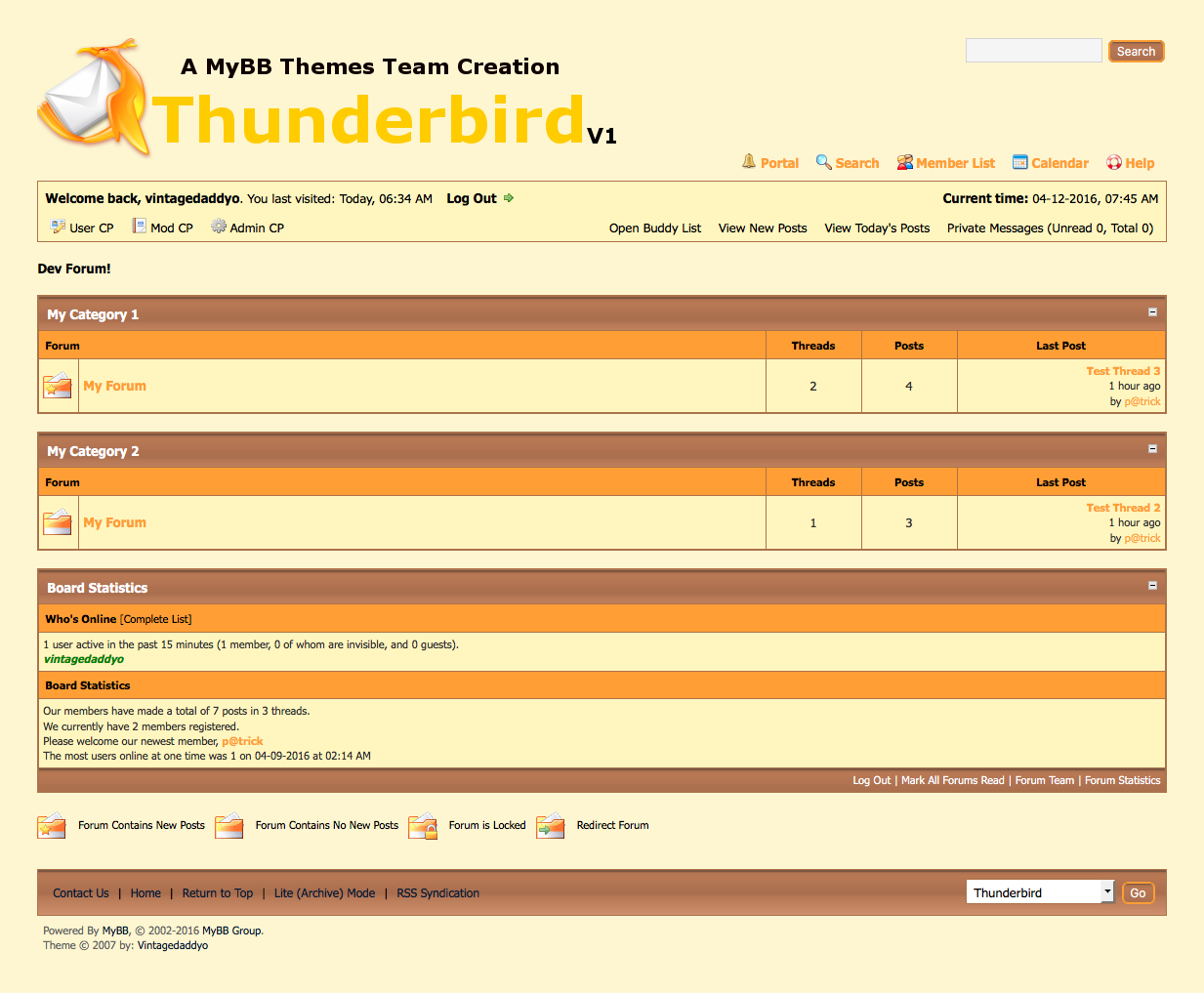 You may not remove or change the MyBB copyright nor the Designed by: "Vintagedaddyo" statements in the footer of this theme's templates. You may use and modify this theme to your personal likings, but redistributing a modified version for download is prohibited, unless you have explicit written permission from "Vintagedaddyo", though you are allowed to redistribute a copy that has not been modified.