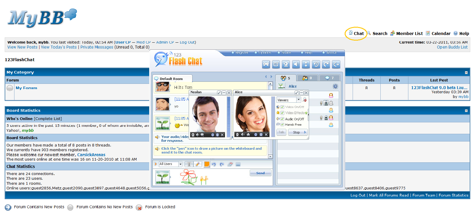 Free plugin to embed a video live chat room into website. Integrating MyBB with 123 Flash Chat.
